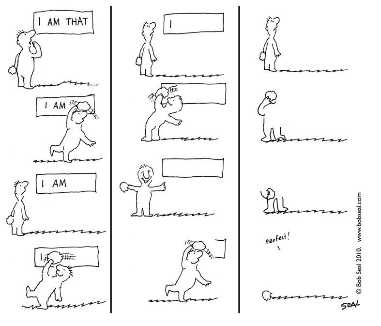 Meg akarom csókolni ezt a pasit. De álljunk meg egy pillanatra? Mégis, ki az, aki meg akarja csókolni? Érzem a vágyat rá. De ki az, aki érzi? Nem is én. Áh, nem jó: “a nem is én” csak egy gondolat. A “nem is én csak egy gondolat” is csak egy gondolat. És ez is. Ez is az. A francba. Elment a pasi. De barom vagyok. De ki az, aki barom?. Ki mondja kiről, hogy egy barom? Hm, senki. Düh van. Ki az, aki szerint düh van? Ez én vagyok? Nincs minden veszve, visszajött. De ki az, aki ennek örül? Ezek csak vágyak, ezek nem lehetek én, én ezen túl vagyok. Nem, ez nem advaitás. Ki mondja mindezt, hogy ezek csak vágyak? Mikor lesz végre már ennek vége? Meddig kell még ezt csinálnom magammal? Miért nem élvezem az életet csak úgy? Ki az, aki abba akarja hagyni a kérdezősködést? Senki. Akkor csinálom tovább. A pasi úgy is lelépett…
